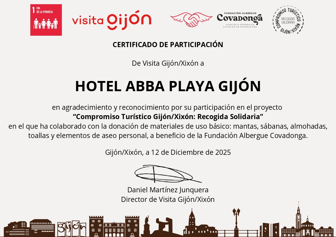 El Hotel abba Playa Gijón ha participado en la iniciativa solidaria “Compromiso Turístico Gijón/Xixón: Recogida Solidaria”, impulsada por Visita Gijón/Xixón, mediante la entrega de mantas al Albergue Covadonga.